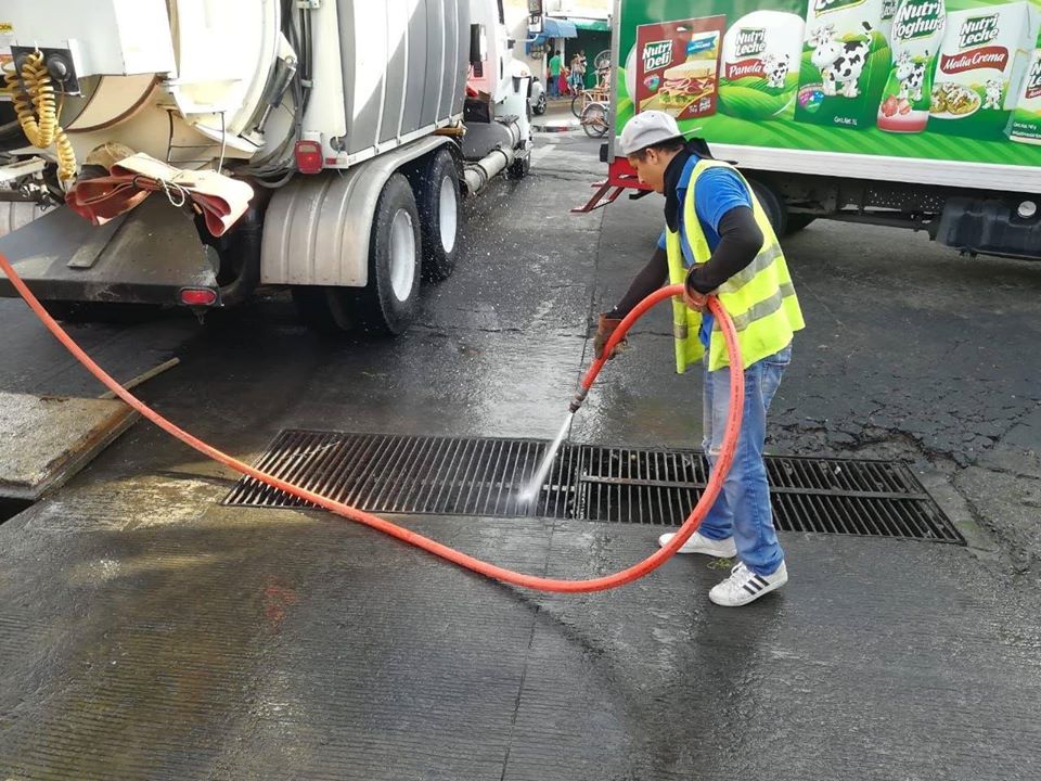Realizamos limpieza de pozos de visita y rampa en la zona del mercado municipal Benito Juárez, retirando el azolve por desechos sólidos y grasas que impedían el flujo y generan mal olor en la zona.