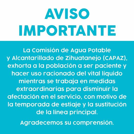 Estamos trajabando en la regularización del suministro de agua potable, te recomendamos mantenerte al pendiente del tandeo diario.