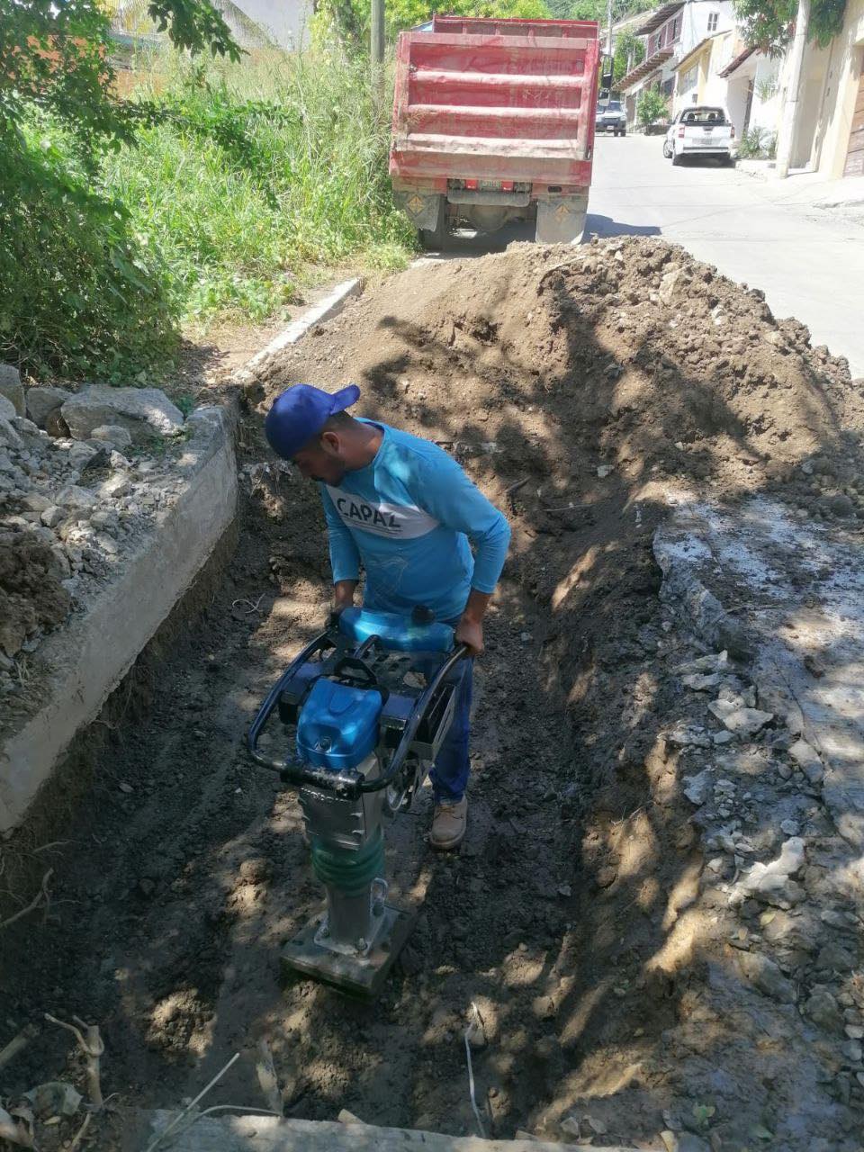 Estamos Trabajando en el bacheo de la reparación de fuga en la línea de distribución de 3 pulgadas en calle Follaje, ubicada en la colonia Hujal.