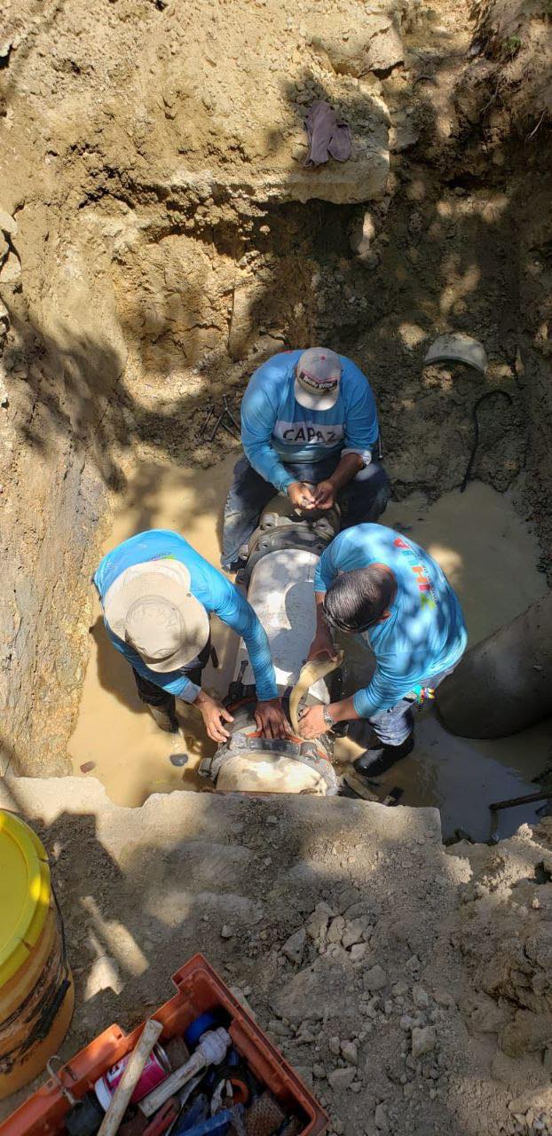 Trabajamos en la reparación de fuga de agua potable en la línea de conducción de 8 pulgadas ubicada en el parque El Limón.