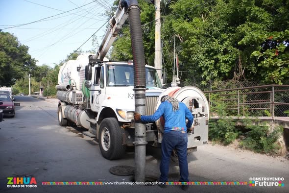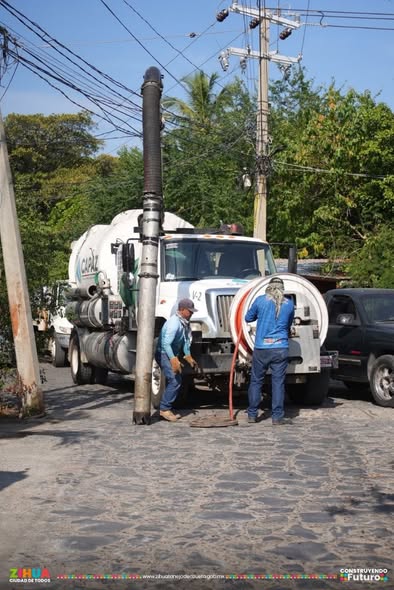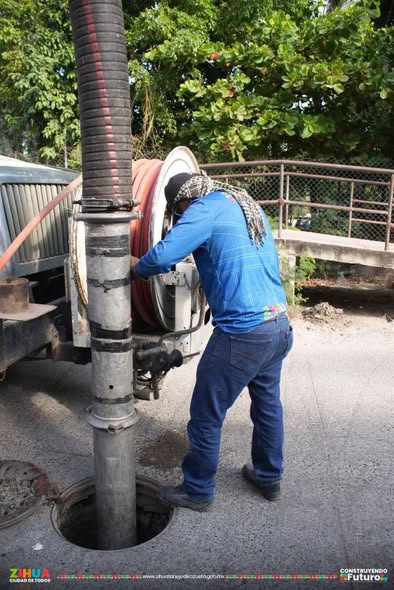 Hoy nuestra Brigada de Saneamiento, con apoyo de la unidad Vactor, realizó trabajos de sondeo y desazolve de la red sanitaria del Cerro del Almacen, en colonia La Noria.