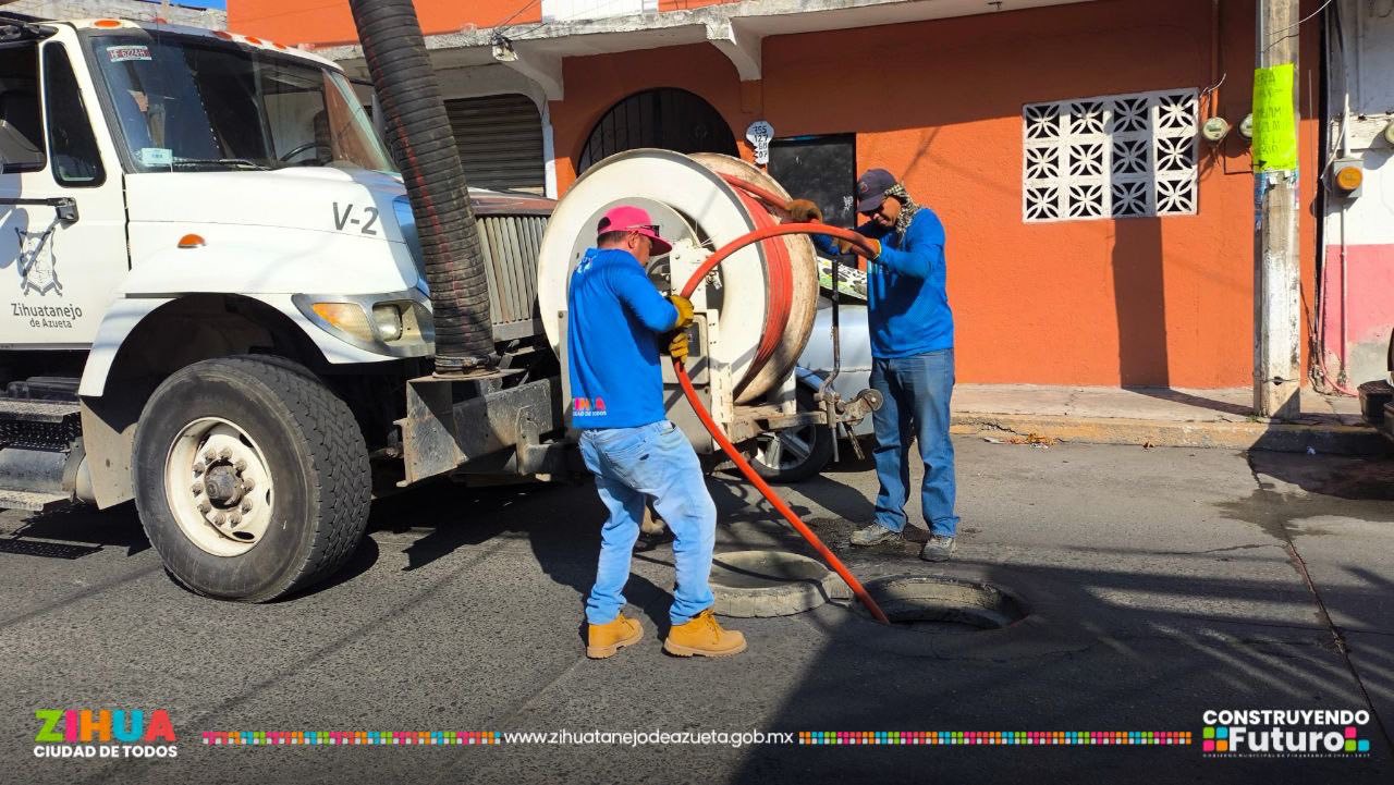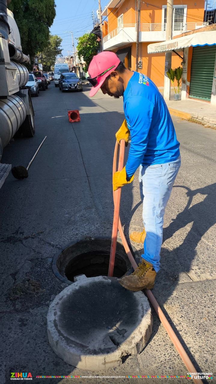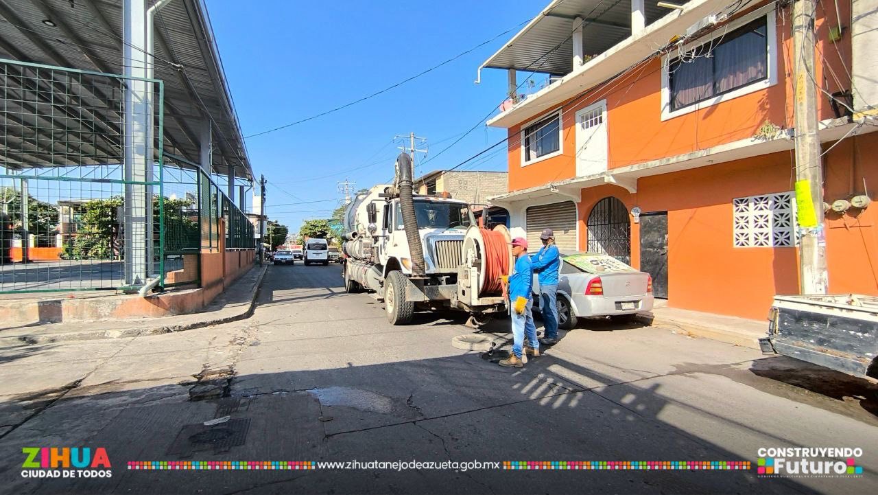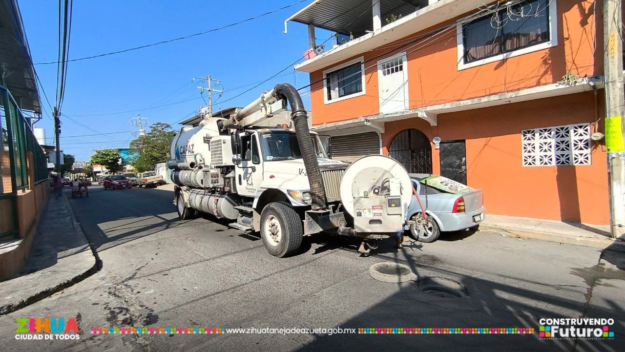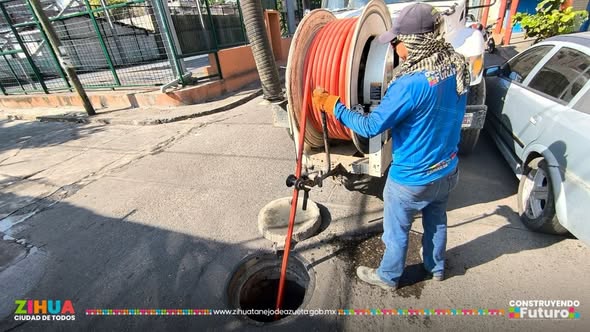 Con la unidad vactor y la brigada de saneamiento realizamos el desazolve y limpieza de la red sanitaria de la calle Luis Donaldo Colosio, ubicada en la colonia Embalse.