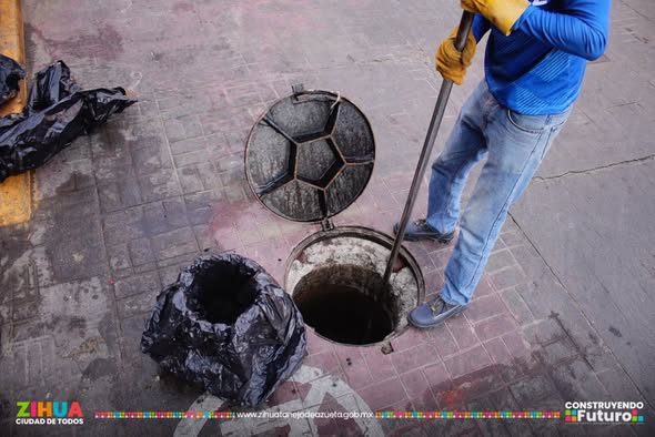 La brigada de saneamiento llevó a cabo trabajos de desazolve en un pozo de visita ubicado en la calle Juan N. Álvarez, en el centro de la ciudad, con el objetivo de mantener en óptimas condiciones la red de drenaje sanitario y prevenir posibles obstrucciones.