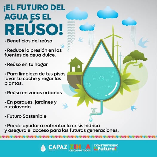 El reúso del agua es una acción sencilla que genera grandes beneficios: reduce la presión sobre nuestras fuentes de agua dulce y nos ayuda a enfrentar la crisis hídrica. Desde casa puedes hacer la diferencia: Usa el agua para limpiar, regar tus plantas o lavar tu auto.