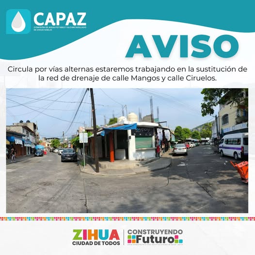 Aviso. Circula con precaución, a partir de hoy estaremos trabajando en las calles Ciruelos y Mangos en la rehabilitación de la red de drenaje de 8 pulgadas.
